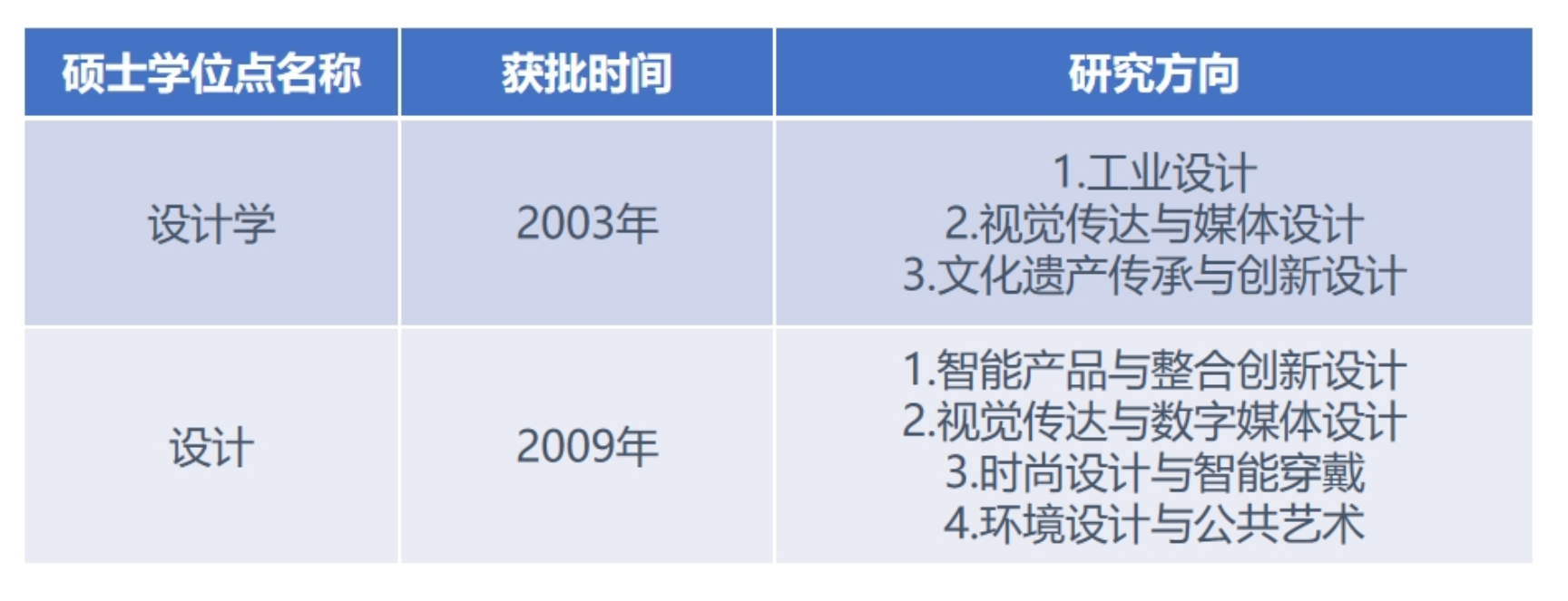学院是国内创建较早、规模较大、专业设置较齐全,具有一定影响力的设计学院。现有2个硕士学位授权点,其中设计学(学术型)获批于2003年,为一级学科、天津市重点培育学科,现有工业设计、视觉传达与媒体设计、文化遗产传承与创新设计3个二级学科;设计(专业型)获批于2009年,现有智能产品与整合创新设计、视觉传达与数字媒体设计、时尚设计与智能穿戴、环境设计与公共艺术4个专业领域。